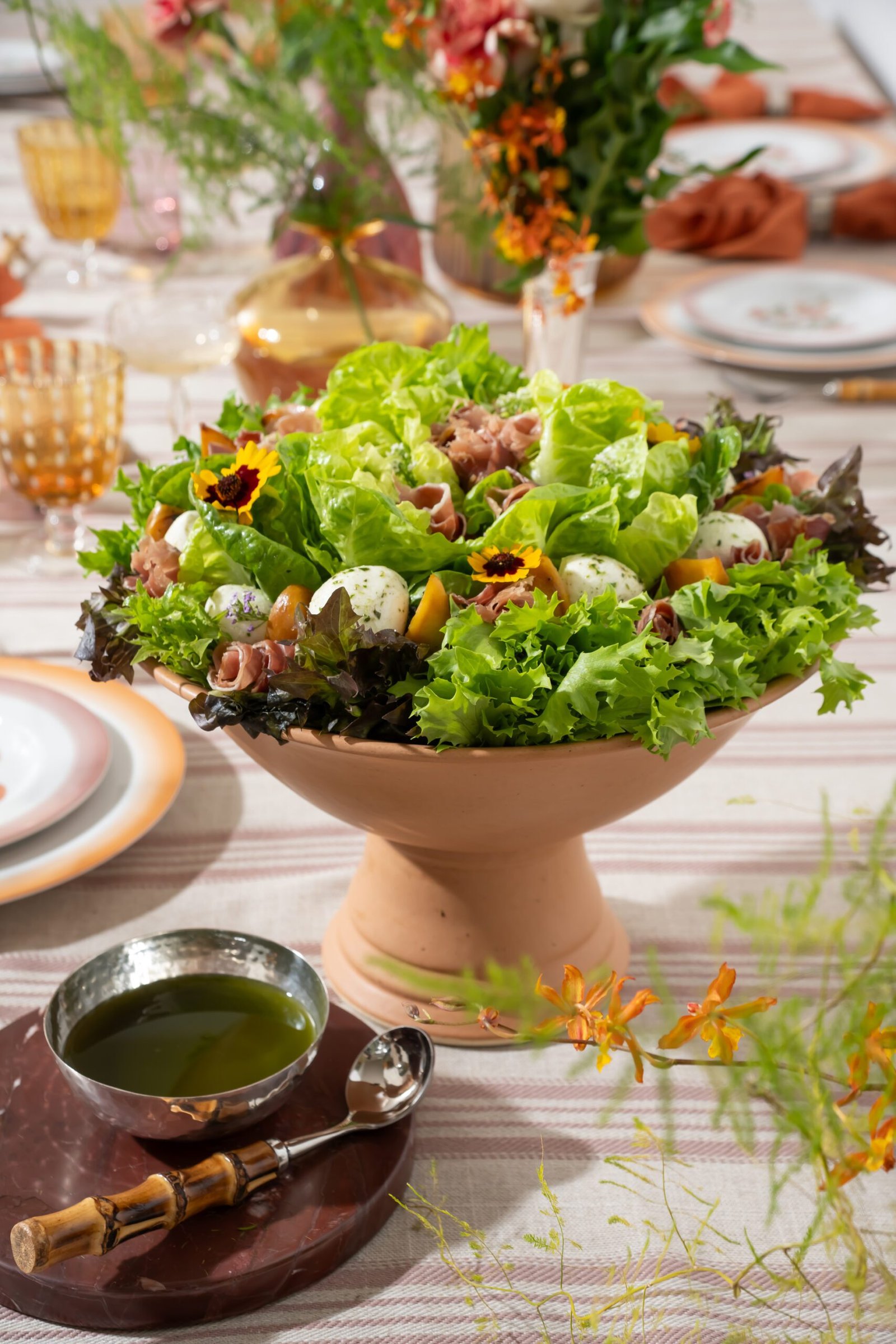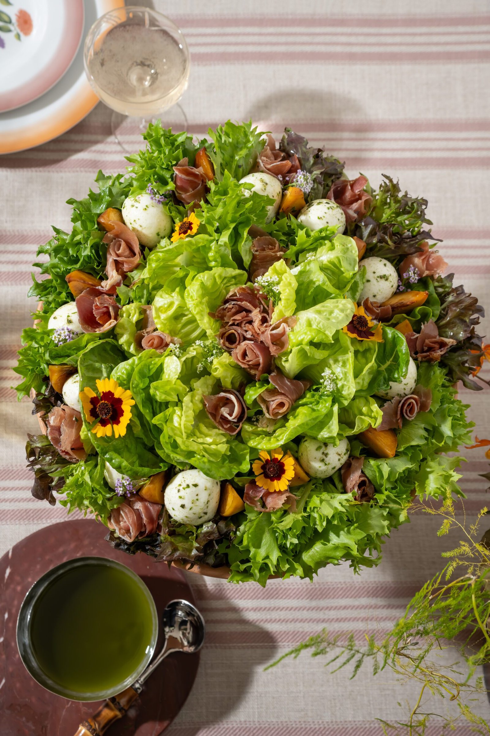06- Salada de folhas com pêssegos grelhados, presunto cru, bocconcino e pesto genovês