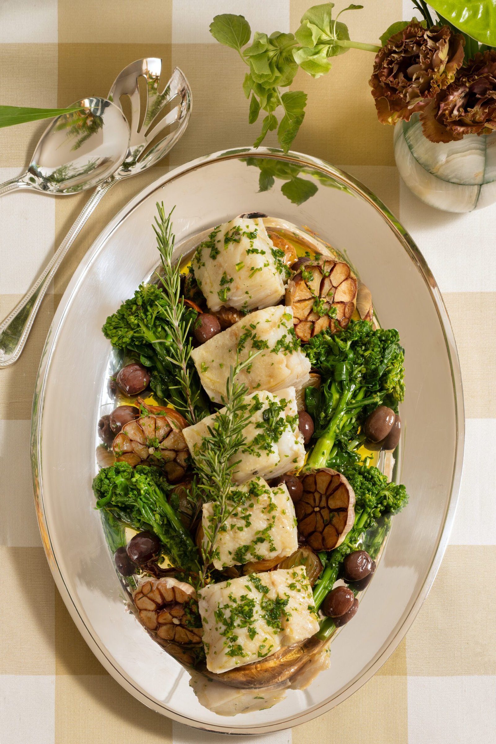 Posta de bacalhau nobre assada lentamente com batatas, brócolis ramoso, alho, cebola e azeitonas pretas ao azeite. Preserva textura, suculência e tradição. Clássico da Páscoa.