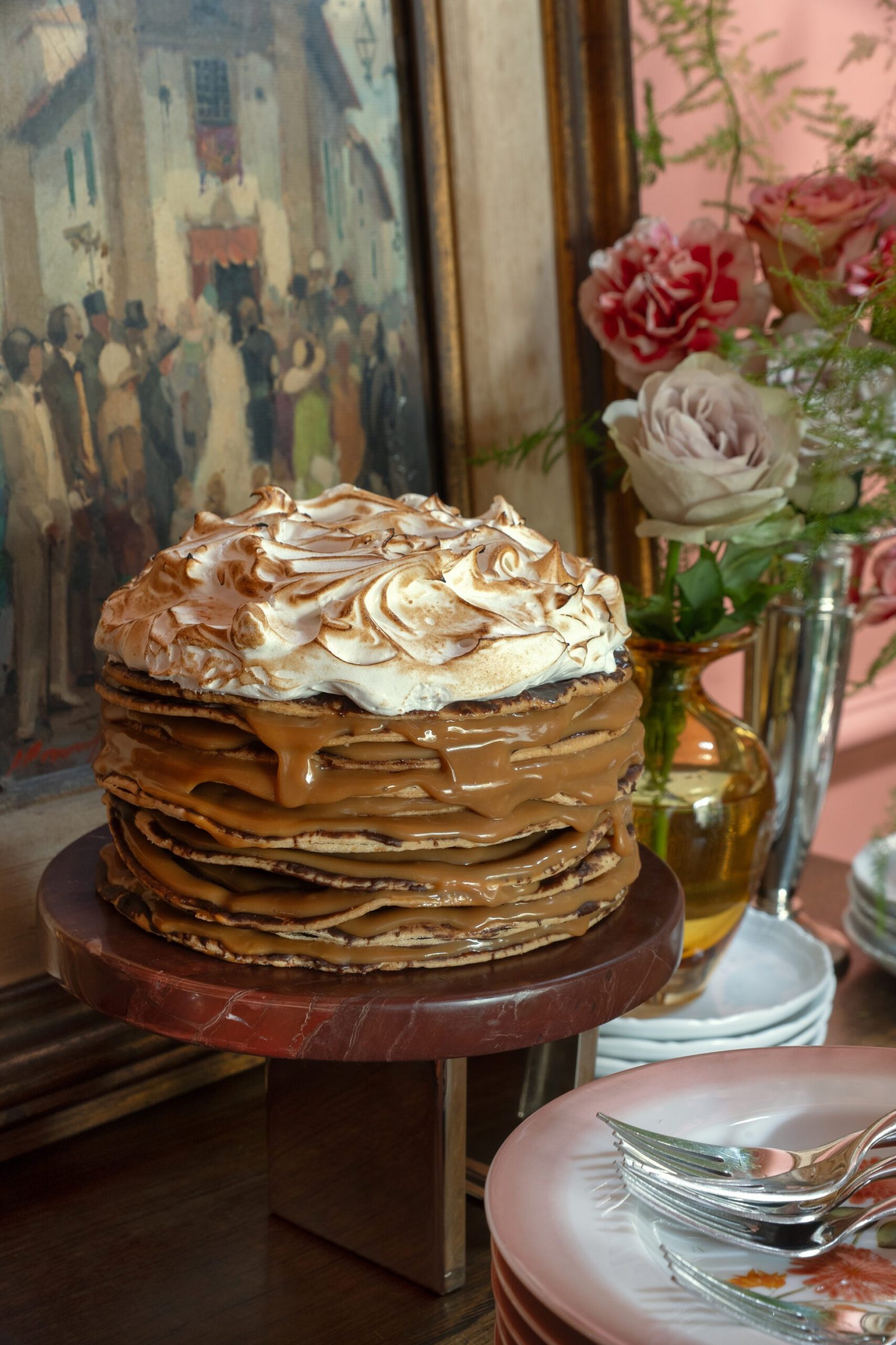 Camadas crocantes intercaladas com doce de leite e finalizadas com merengue tostado.