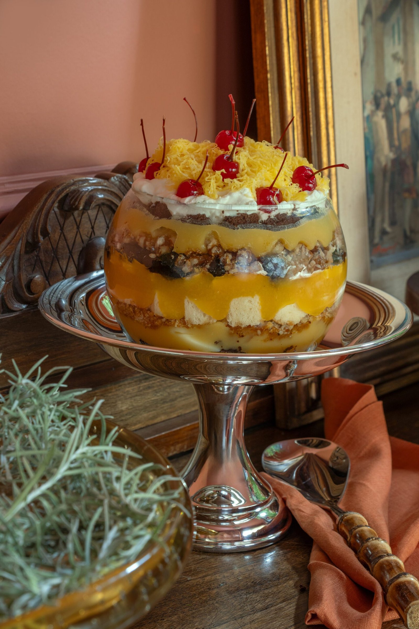 Inspirado no clássico bolo Marta Rocha, com camadas de chocolate, baba de moça, crocante de nozes, doce de ameixa, chantilly e fios de ovos.