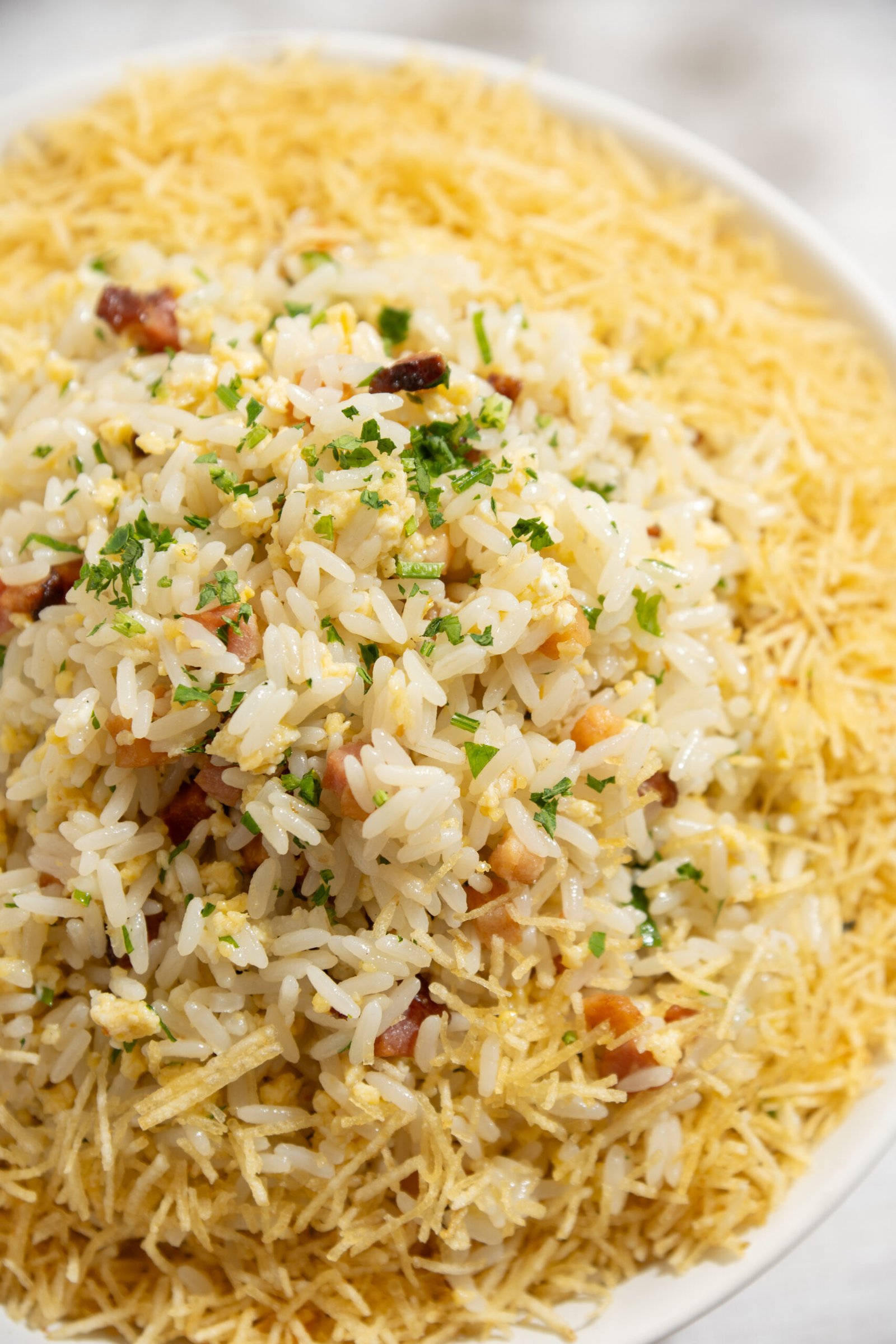 Arroz soltinho com ovos, bacon, batata palha e cebolinha, no estilo clássico paulista.