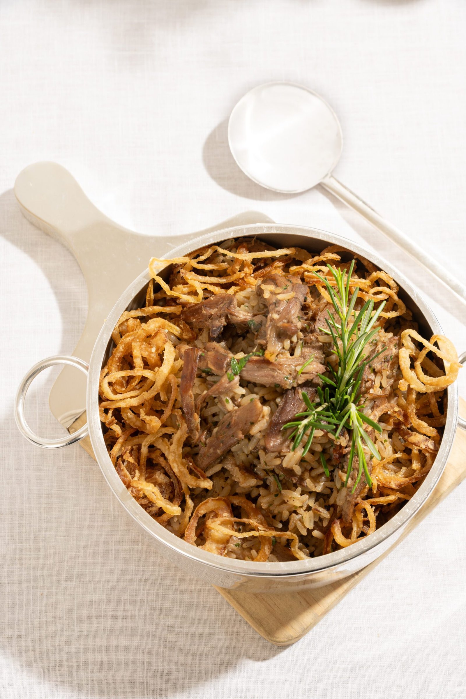 Arroz aromático feito com cordeiro desfiado e toque de especiarias, finalizado com crispy de cebola.
