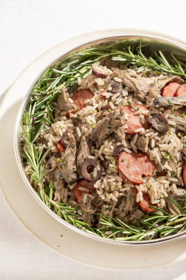 Receita inspirada na culinária portuguesa, com pato desfiado e em lascas, linguiça artesanal e azeitonas. Uma escolha certeira para para receber em casa com um prato único cheio de sabor.