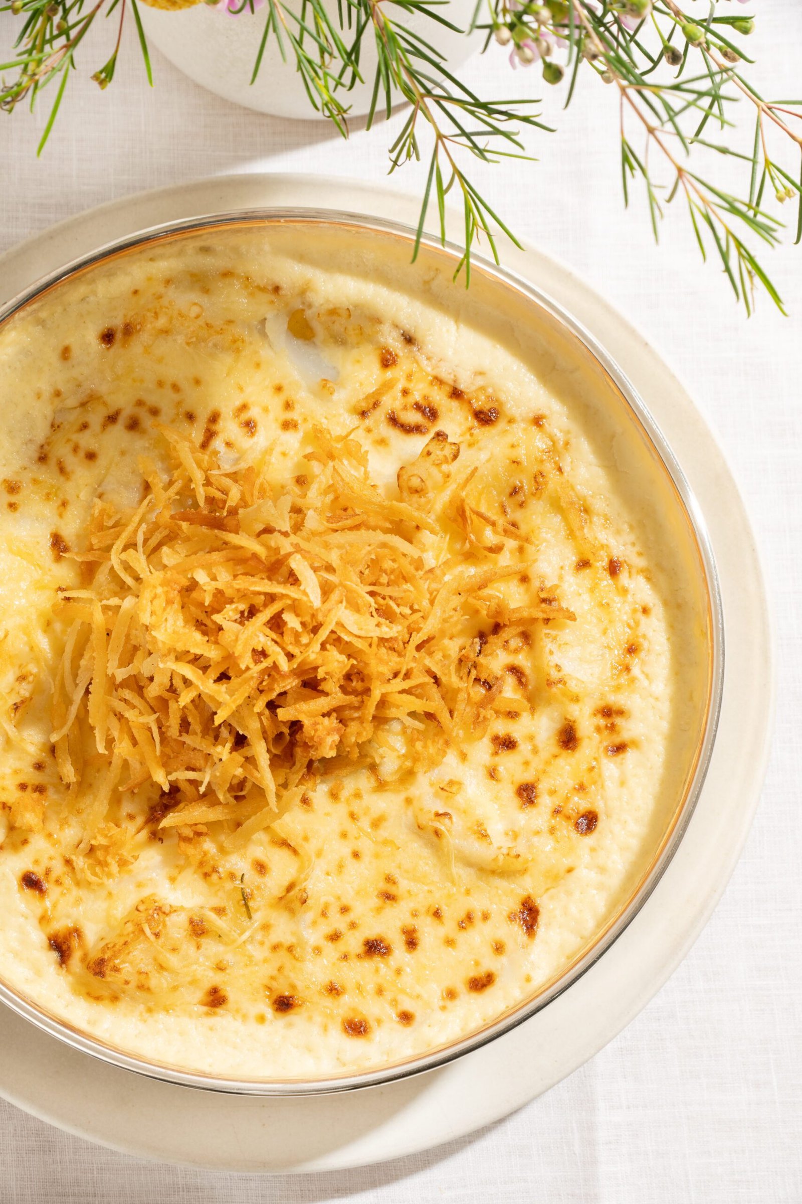 Versão especial do clássico português, preparado com lascas de bacalhau Gadus Morhua, molho cremoso e mandioca palha para acompanhar.