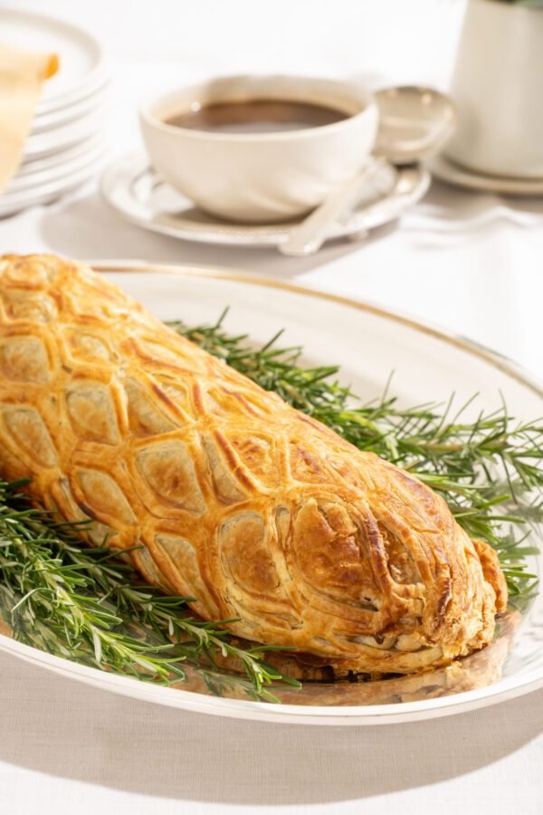 Transfira o Beef Wellington delicadamente para uma travessa de sua preferência e sirva o molho em uma molheira à parte.