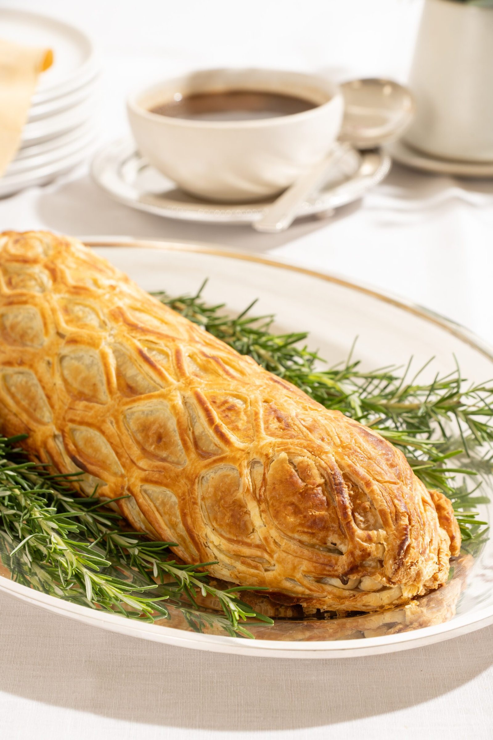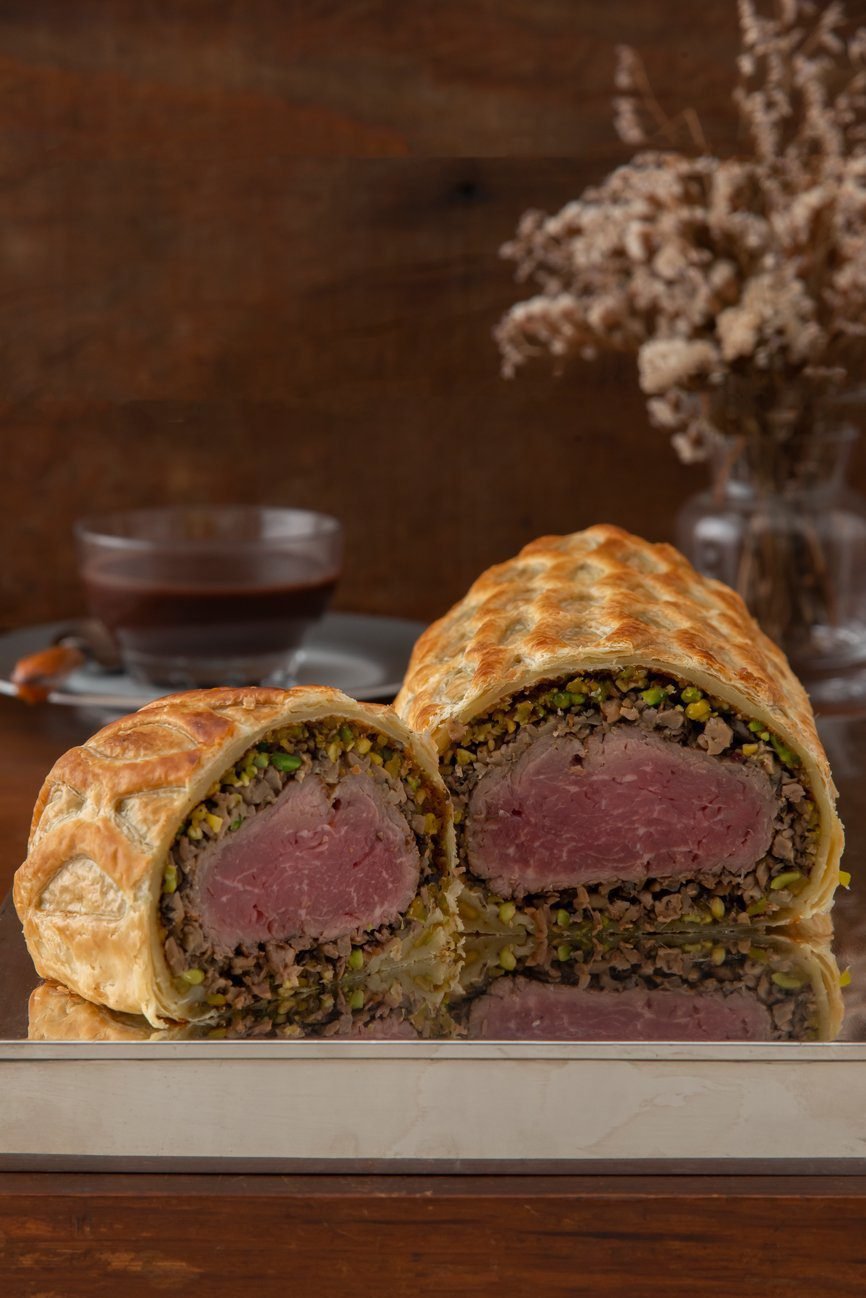 Nossa versão de Beef Wellington. Mignon envolto em massa folhada, recheado com cogumelos e pistache. Acompanha molho roti.