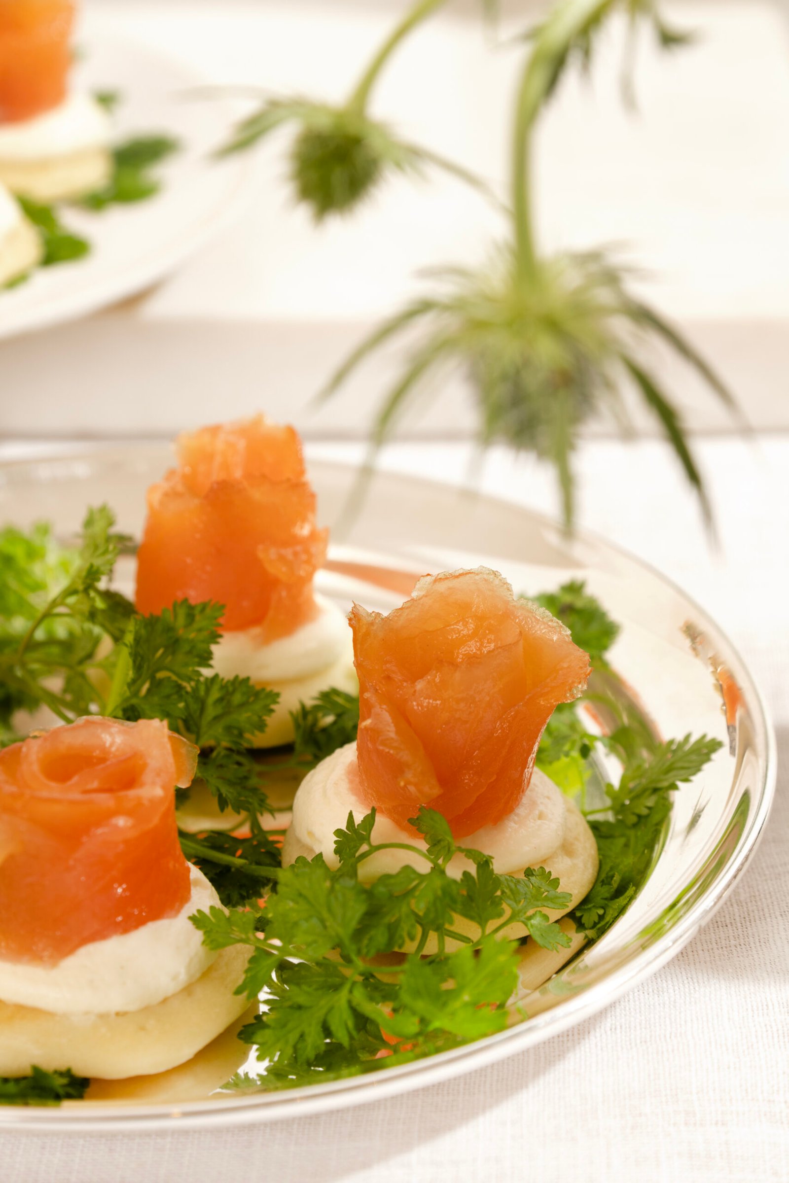 Mini panquequinhas leves e delicadas, servidas com flor de salmão defumado e sour cream artesanal.