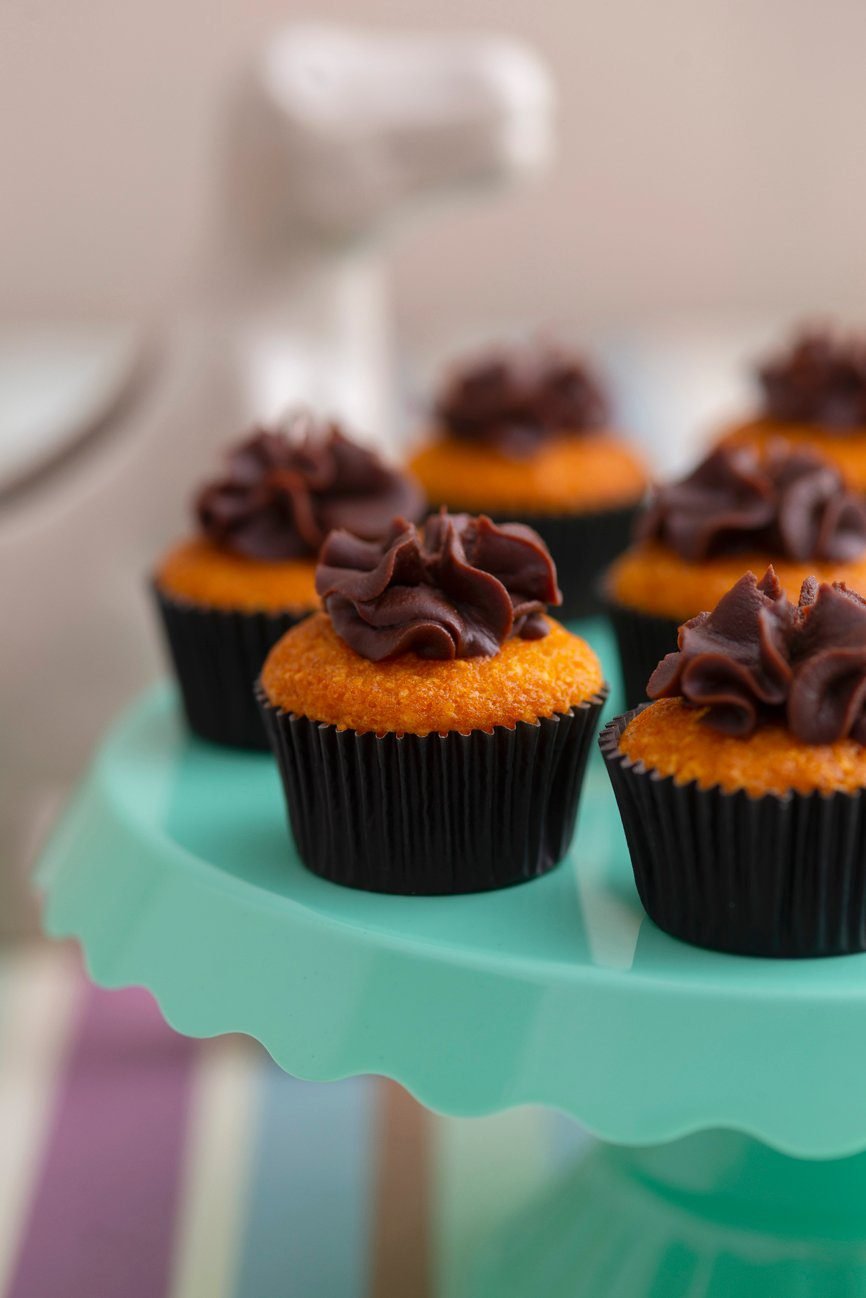 Mini bolo de cenoura macio, coberto com ganache aveludada de chocolate.
