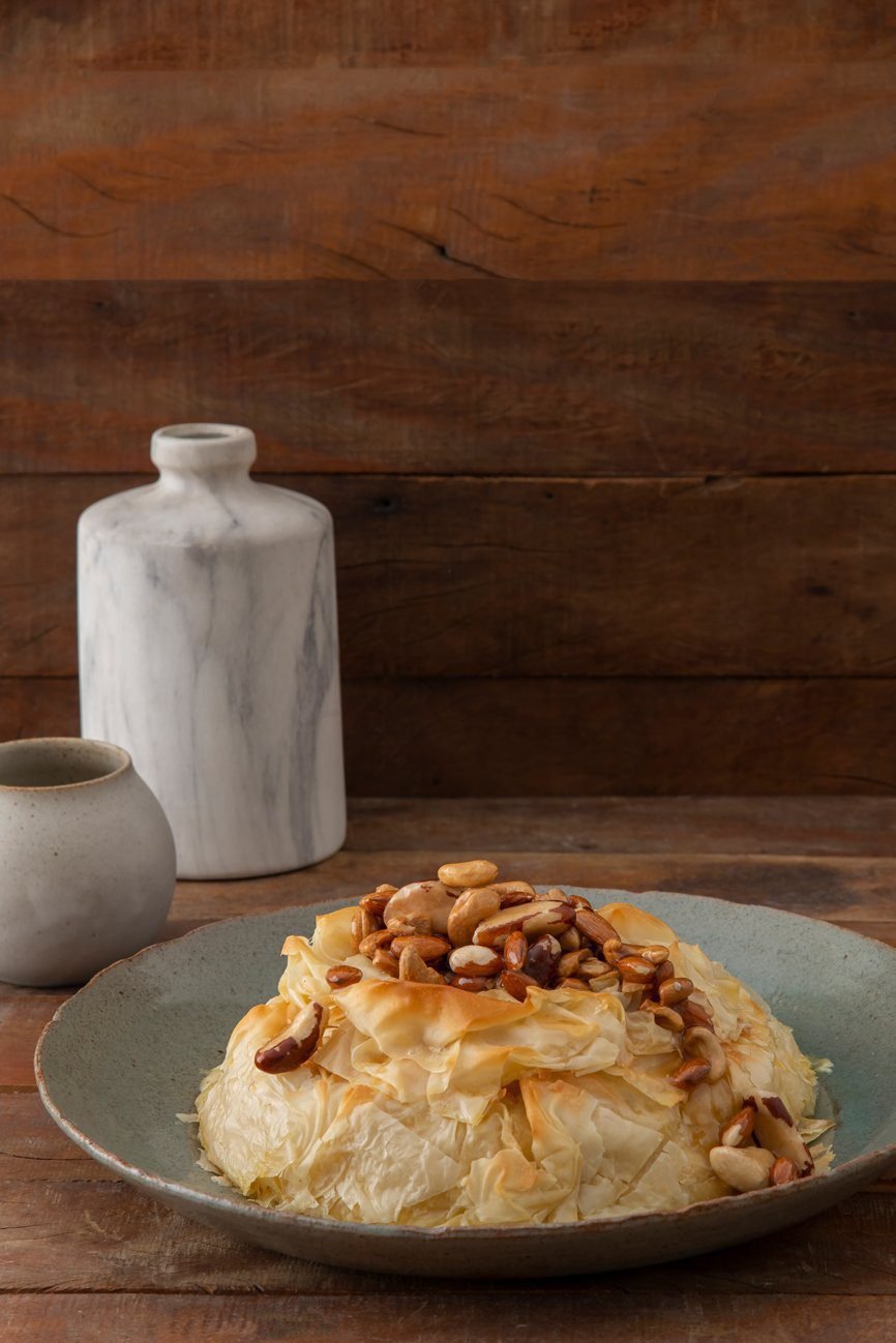 Queijo brie envolto em massa folhada acompanha mel e mix de nuts. Um best seller presente em quase todas nossas festas.