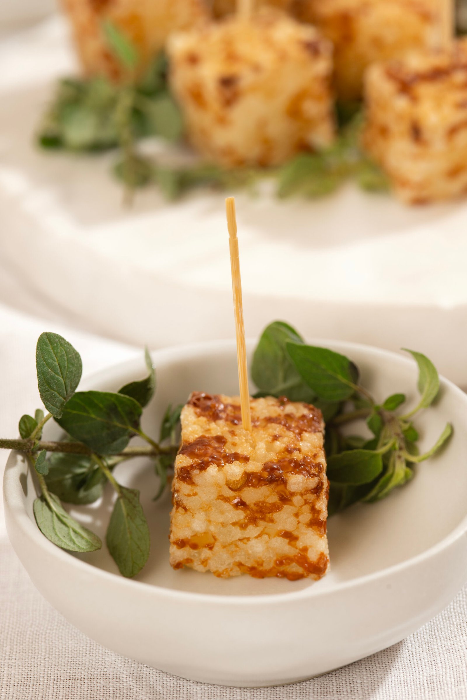 Espete palitinhos nos dadinhos. Em um bowl ou molheira de sua preferência, coloque o mel para acompanhar.