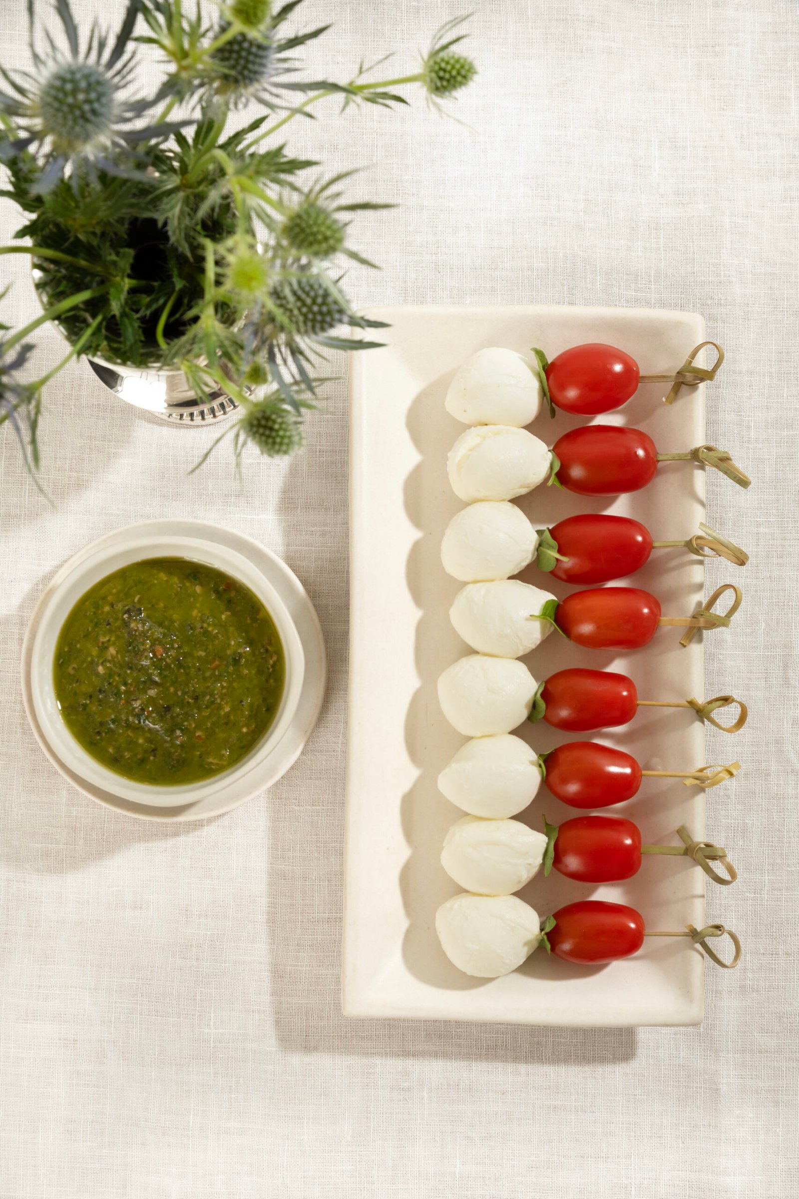 Retire da geladeira 30 minutos antes de consumir, disponha os espetos caprese em uma travessa de sua preferência.