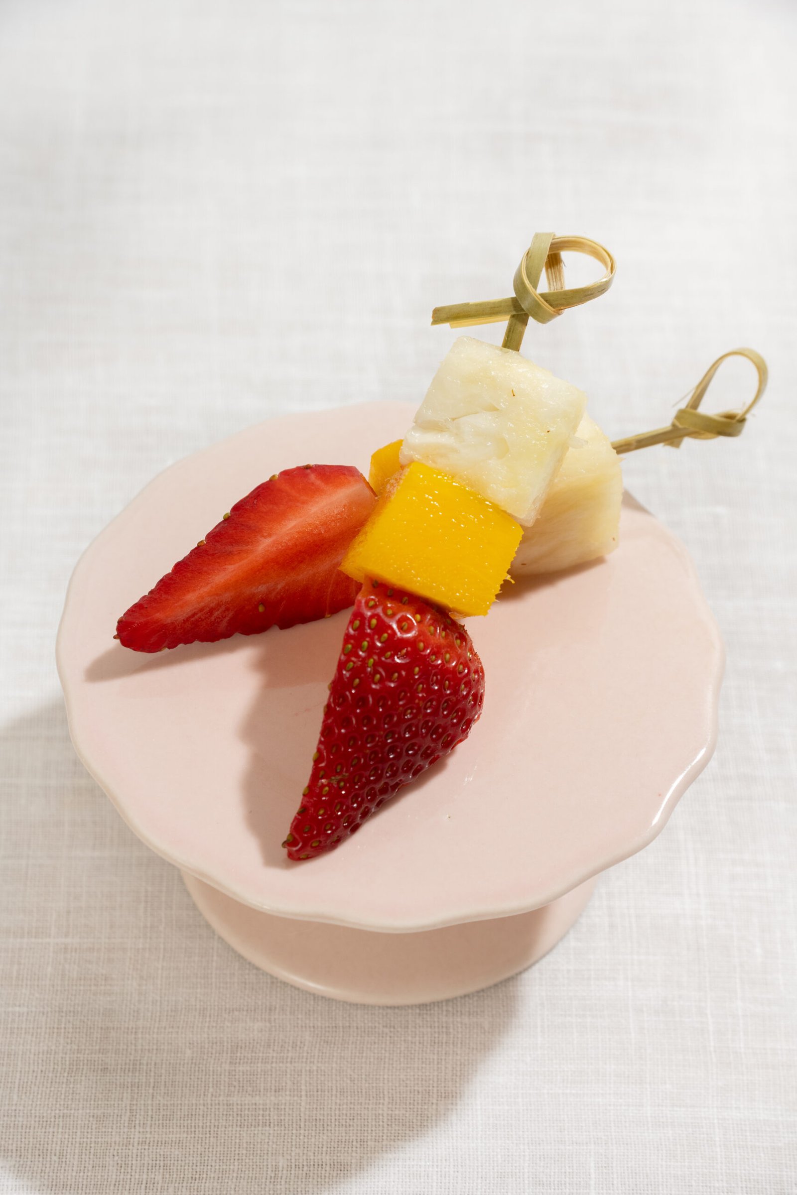 Seleção de frutas frescas da estação cuidadosamente cortadas e servidas em espeto.
