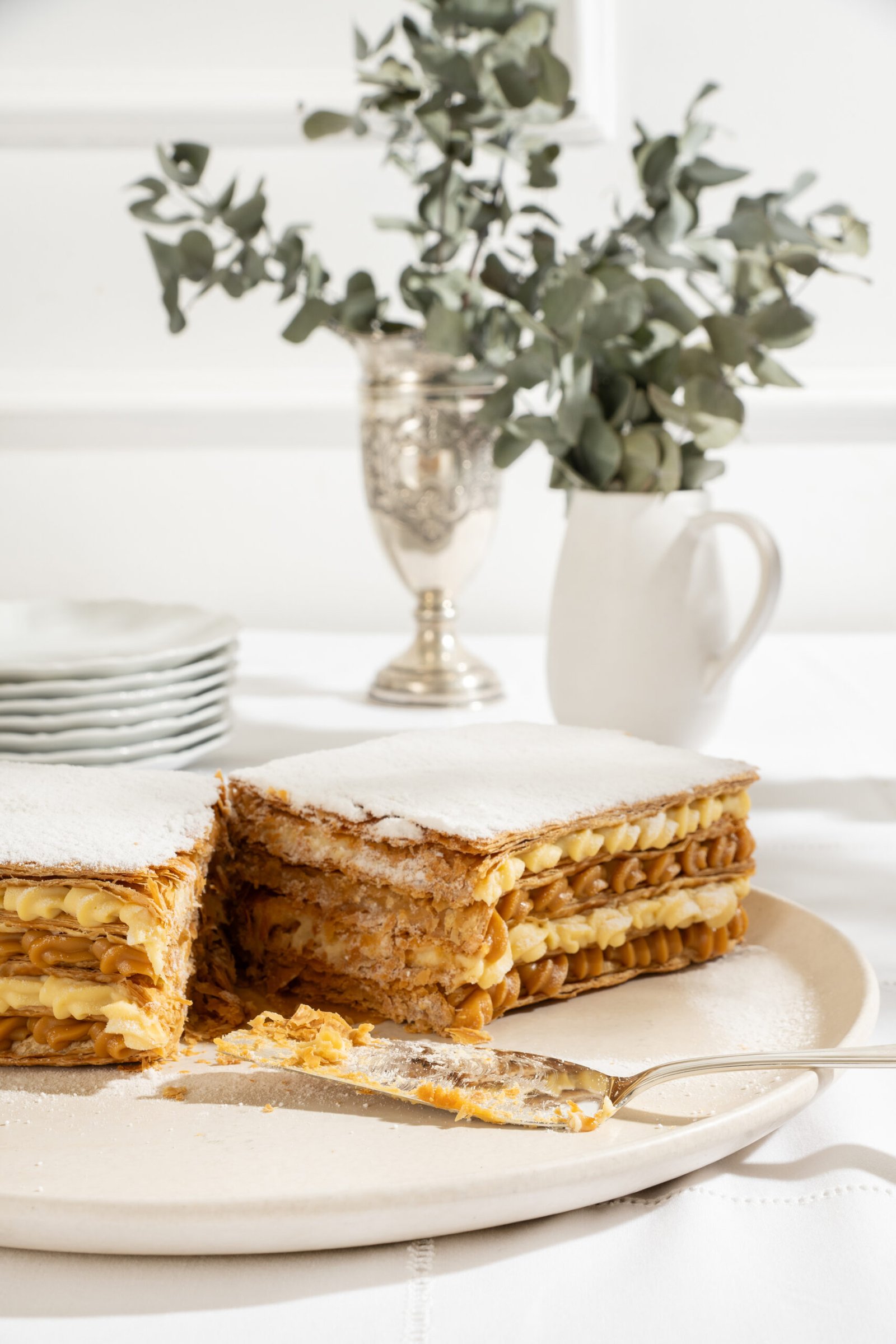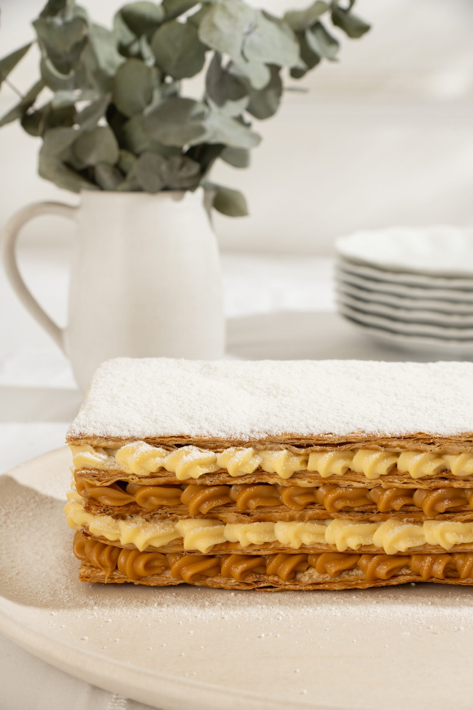 Massa folhada leve e crocante com recheio de doce de leite e finalizada com açúcar de confeiteiro.