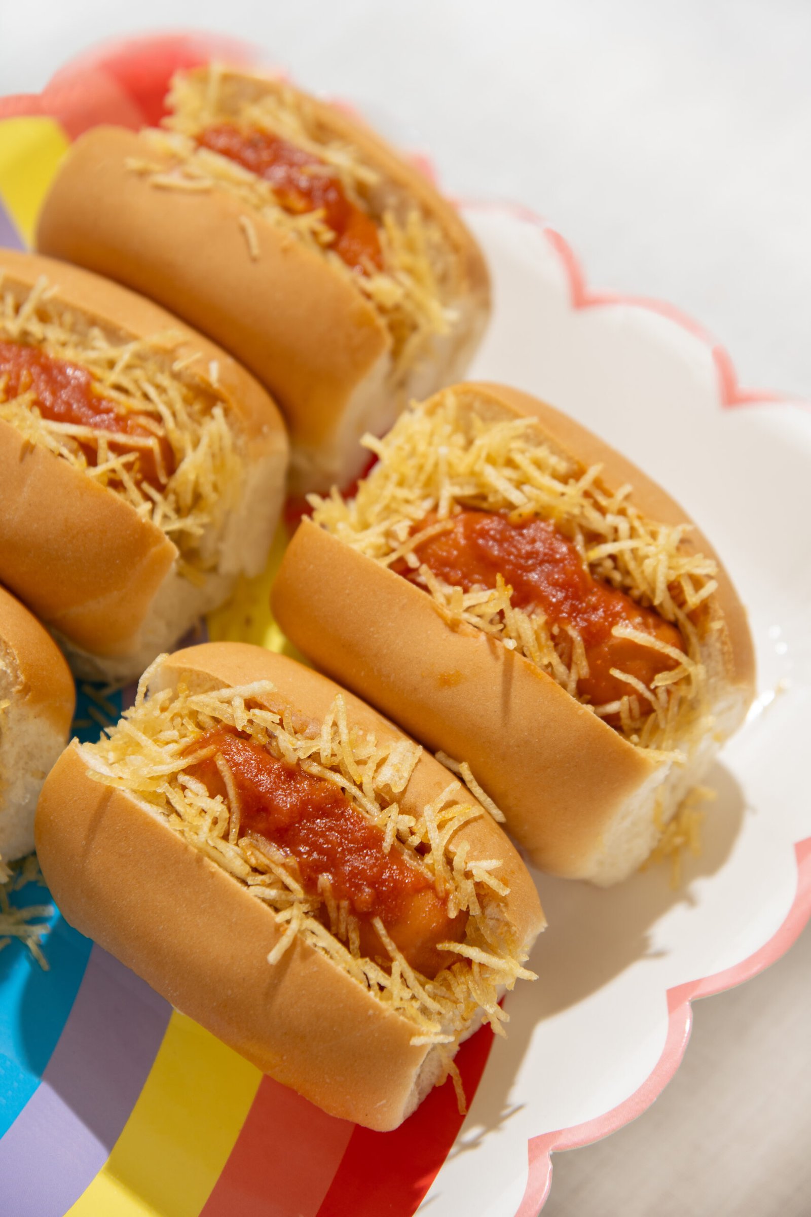 Versão mini do clássico hot dog, com salsicha ao molho de tomates frescos, mini pão de hot dog e batata palha crocante. Os itens vão separados para montagem e finalização no momento de servir. Pronto para aquecer e montar.