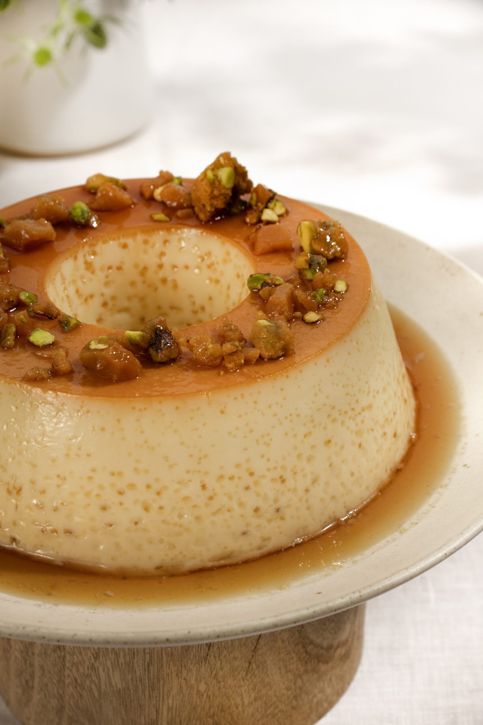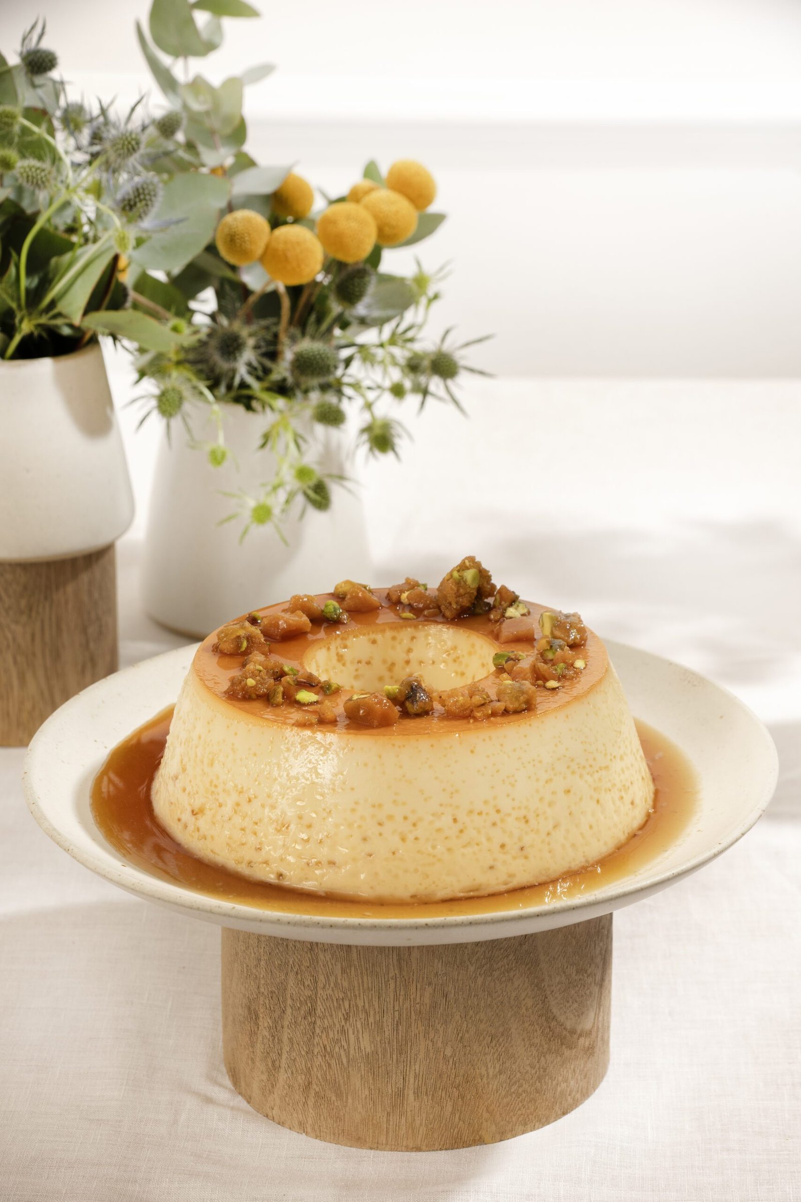 Pudim de leite de ficar na memória. Textura lisinha, firme e cremosa. Acompanha calda de açúcar e crocante de pistache.