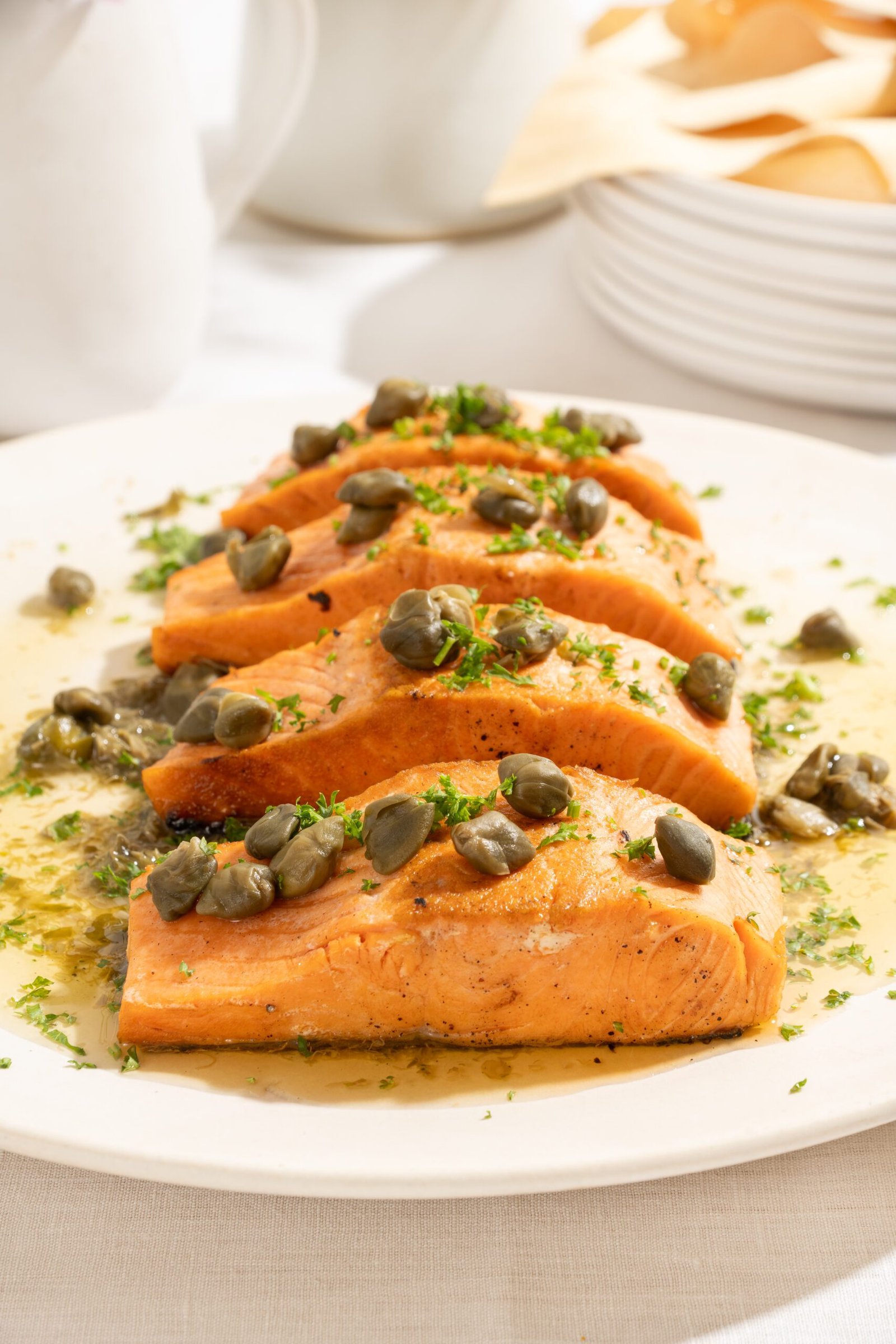 Postas de salmão grelhadas até o ponto perfeito, servidas com molho de alcaparras e toque de limão siciliano.
