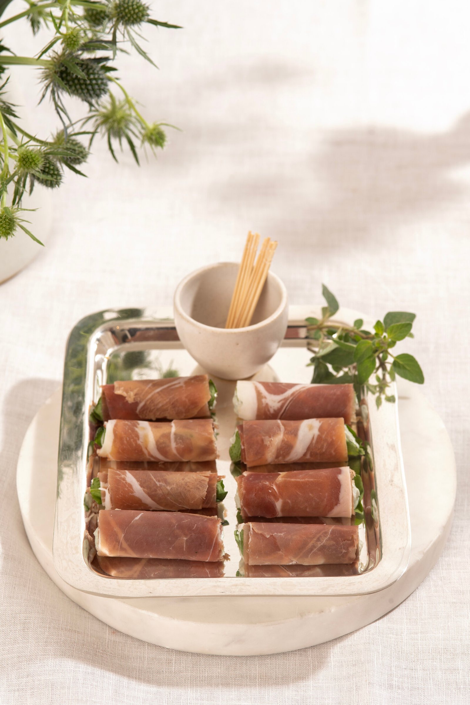 Delicadas lâminas de presunto parma envolvem o creme de blue cheese e folhas frescas de rúcula, criando uma combinação equilibrada de sabor e textura. Pronto para servir.